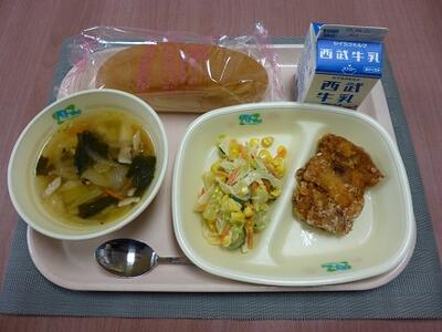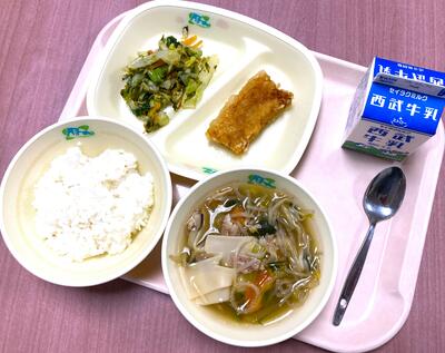 〇本日の給食は「ご飯、イカの竜田揚げ、チンゲン菜ののりサラダ、ワンタンスープ、牛乳」です。