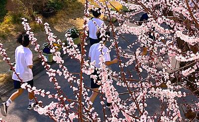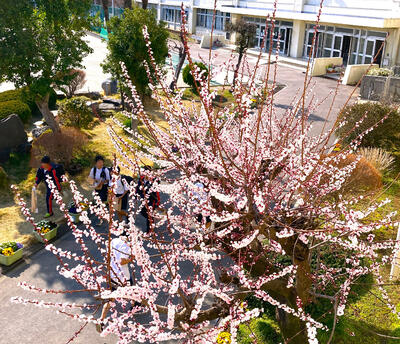 ○2年昇降口脇の杏の花が満開です。