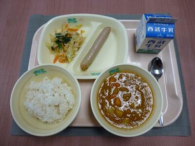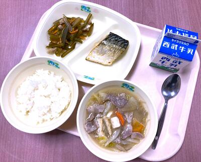 〇今年度最後の給食は「ご飯、鯖のカレー焼き、茎わかめの炒め煮、春キャベツの豚汁、牛乳」です。