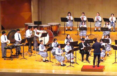 〇吹奏楽部が、所沢市民文化センターミューズ アークホール で開催された「所沢市吹奏楽祭」で演奏しました。今年は、いつもご指導いただいている皆様と共に「ワシントンポスト(作曲:J.P.スーザ)」と「稲穂の波(作曲:福島弘和)」を演奏しました。