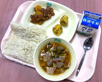 〇本日の給食は「ハ~ところん五目うどん(地粉うどん)、チーズ入りちくわ磯辺揚げ、金時豆のかぼちゃぜんざい、牛乳」です。