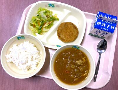 〇本日の給食は「ご飯、とことこチキンカレー、里芋コロッケ、フレンチサラダ、牛乳」です。