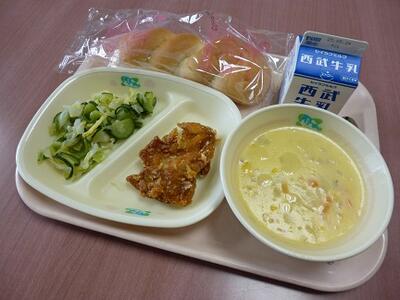 今日のメニューは、Qチキ(究極チキン)、コーンチャウダー、グリーンサラダ、ツイストパン、牛乳です。