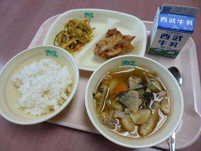 今日のメニューは、鶏肉のから揚げ、切干大根のカレー炒め、すいとん、ごはん、牛乳です。体育祭練習後の給食は、最高です。