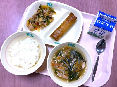 〇本日の給食は「ご飯、春巻、豚肉とキムチの炒め物、春雨スープ、牛乳」です。