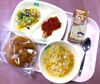 〇本日の給食は「ライスボールパン、鶏肉のトマトソース、ほうれん草サラダ、ABCスープ、コーヒーミルク」です。