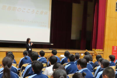 ○「思春期の心身の特質をもとに、互いに相手を理解し、人格を尊重する心や態度を育てる」「望ましい人間関係を築いていくため、より適切な意思決定と行動選択ができる能力や態度を育てる」ことをねらいとして、スクールカウンセラーさんより「思春期の心と身体」についての講演をいただきました。