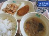本日のメニューは、鶏肉のガーリック焼き、フレンチサラダ、コーンチャウダー、黒パン、コーヒー牛乳です。鶏肉のガーリック焼きの香りが食欲を引き立てます。