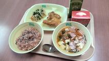 本日のメニューは、赤飯、鶏肉の唐揚げ、味噌和え、お祝いすまし汁、お祝いケーキ、お茶です。明日の卒業を祝う豪華メニューとなっています。